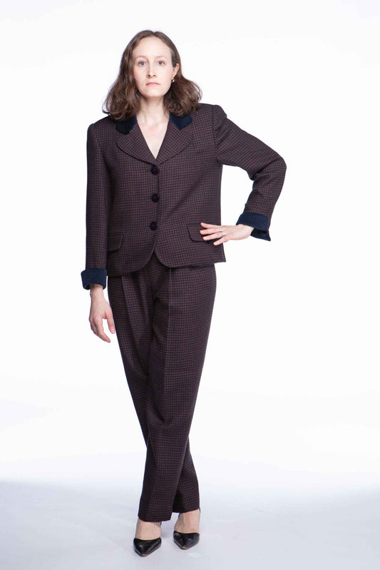 Christian Dior 1980s Wool Navy and Chocolate Houndstooth Suit with Velvet Details