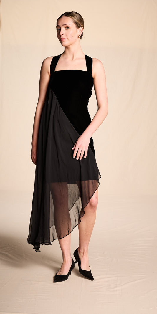 Bill Blass 1990s Black Velvet Cocktail Dress with Silk Chiffon Trim