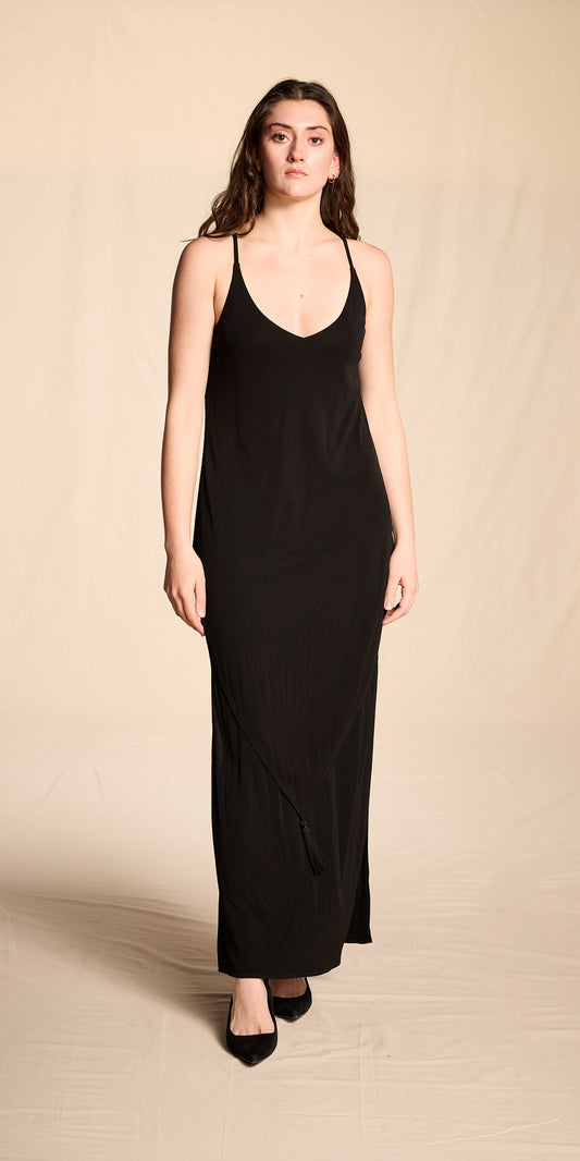 Holly Harp 1970s-1980s Black Rayon Gown With Tassels