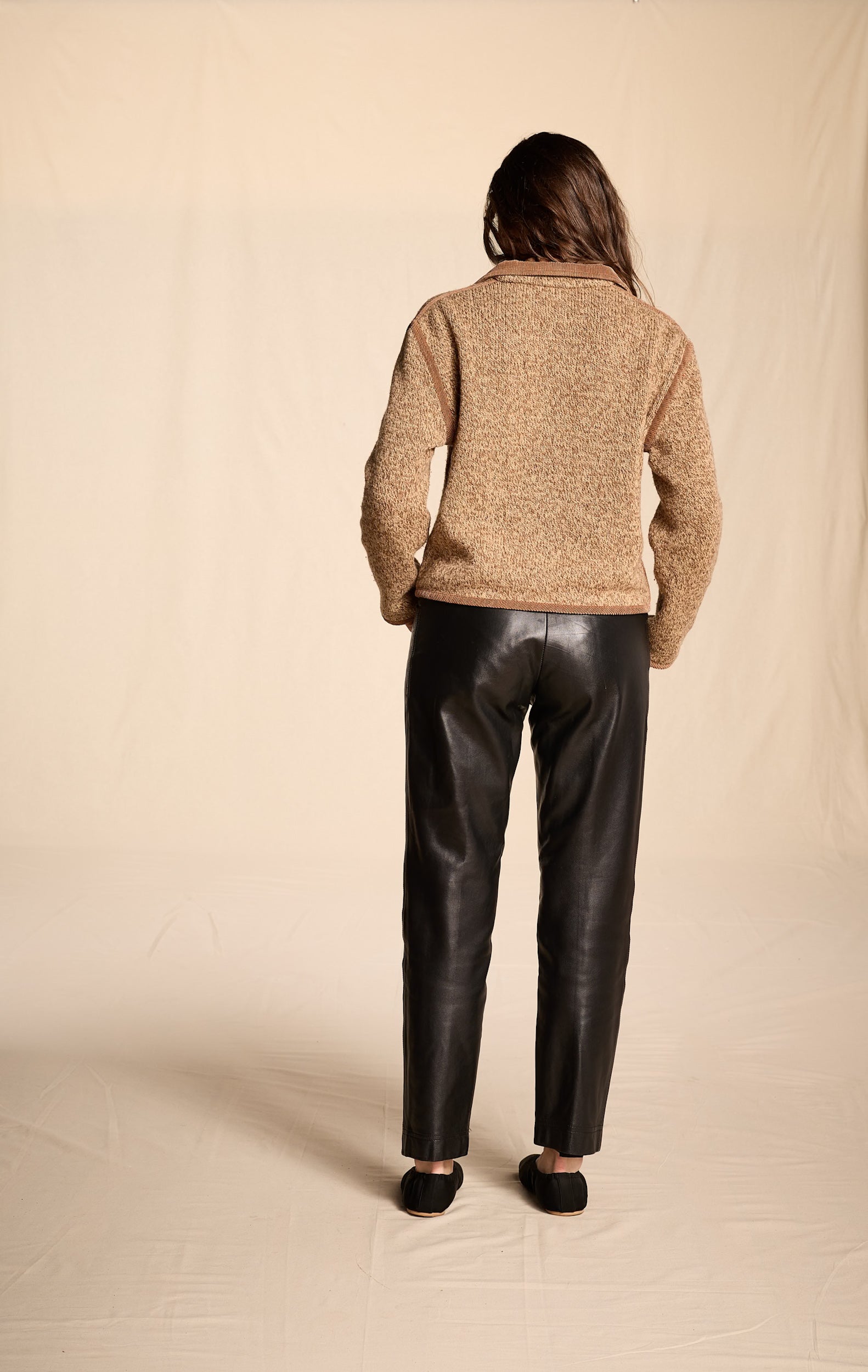 Like our Beene Bag Silk Striped Pants, this jacket sweater illustrates continuities across the Geoffrey Beene Ready-to-Wear Line and the Beene Bag diffusion line. The quintessentially “Beene” detail of this sweater is the diagonally corded trim, which runs counter to the vertical weave of the sweater’s knit. It is also a departure from the RTW line, style-wise, in being slightly bohemian. The Beene team chose this sweater to represent the Beene Bag line in their 1983 Spring Advance.