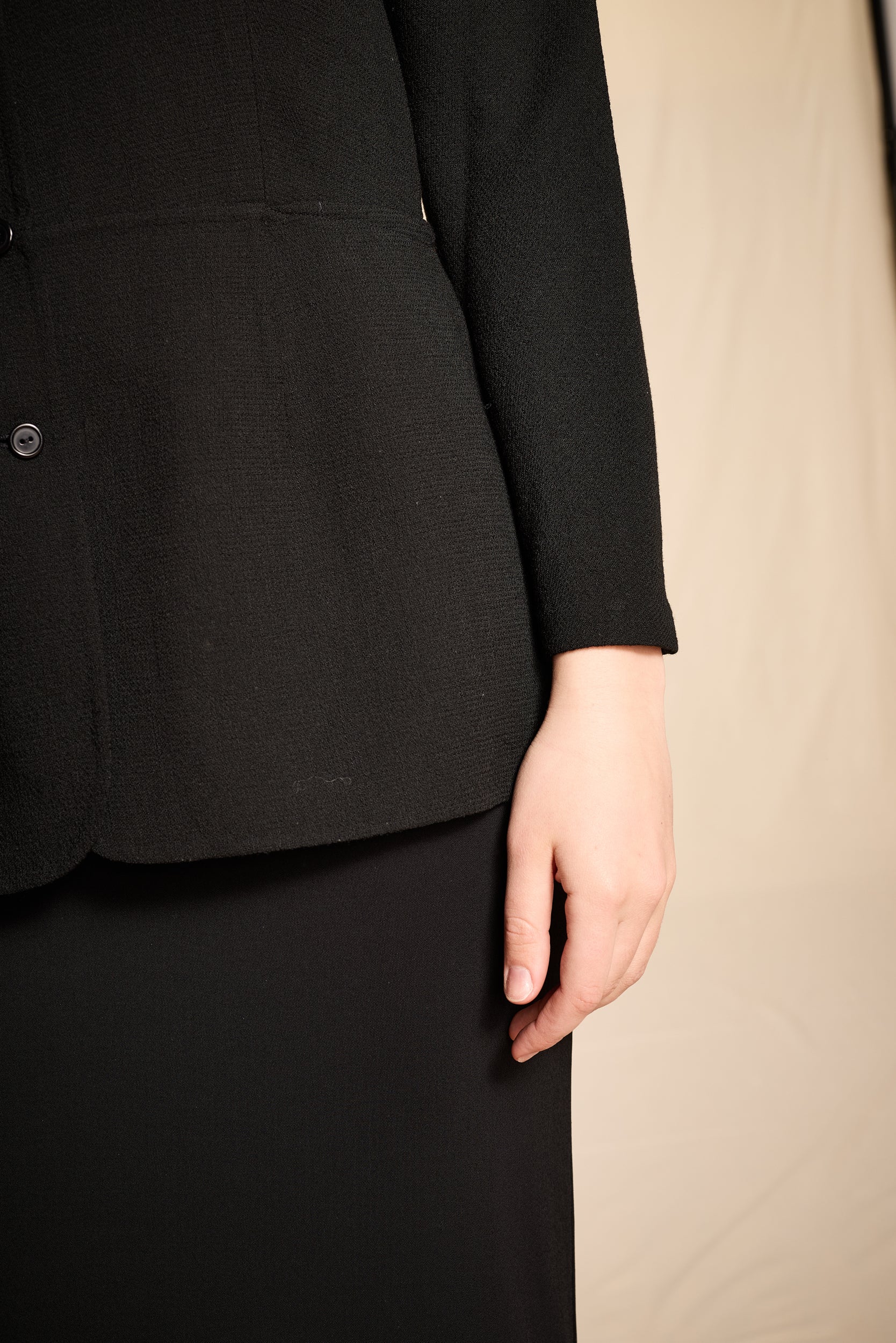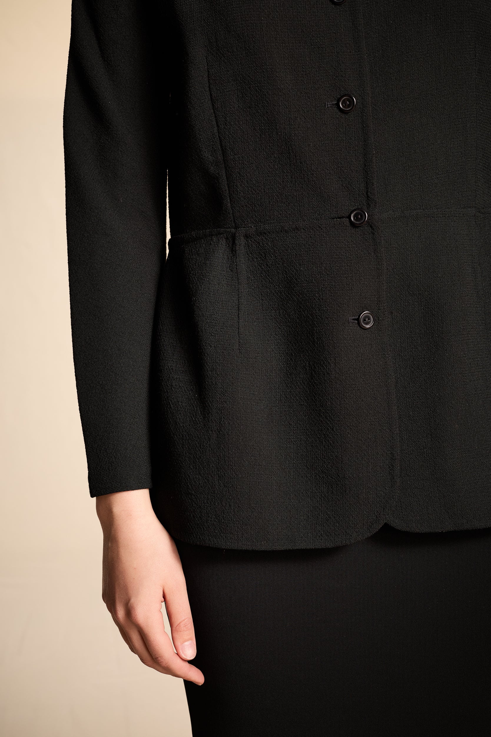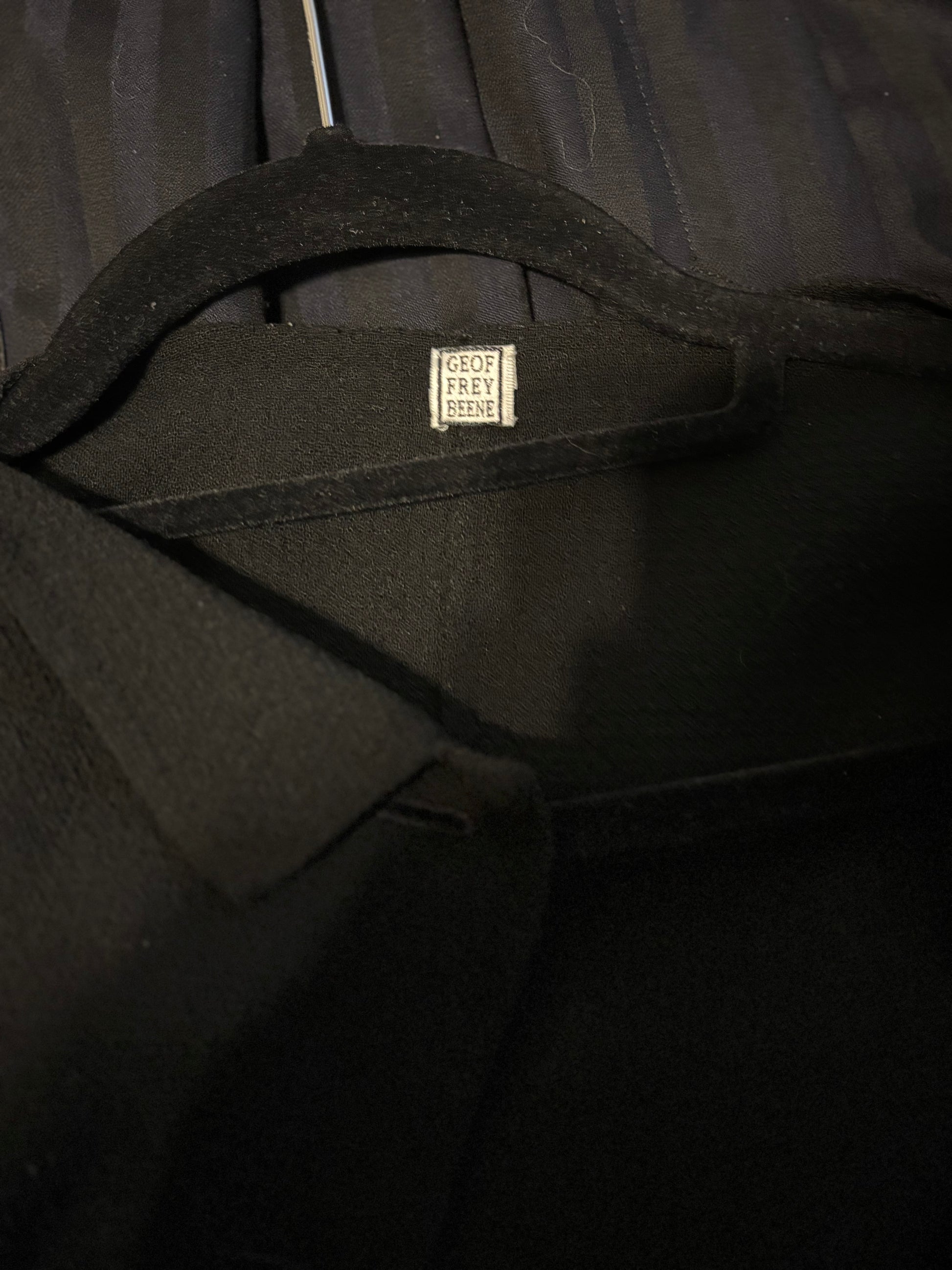 Manifold Vintage's Spring/Summer 2026 Collection features two black, crepey, 1990s Geoffrey Beene jackets; we think they are best described together. The jacket described in listing is Jacket B, this is Jacket A; a comparison image can be found in this listing’s photos.