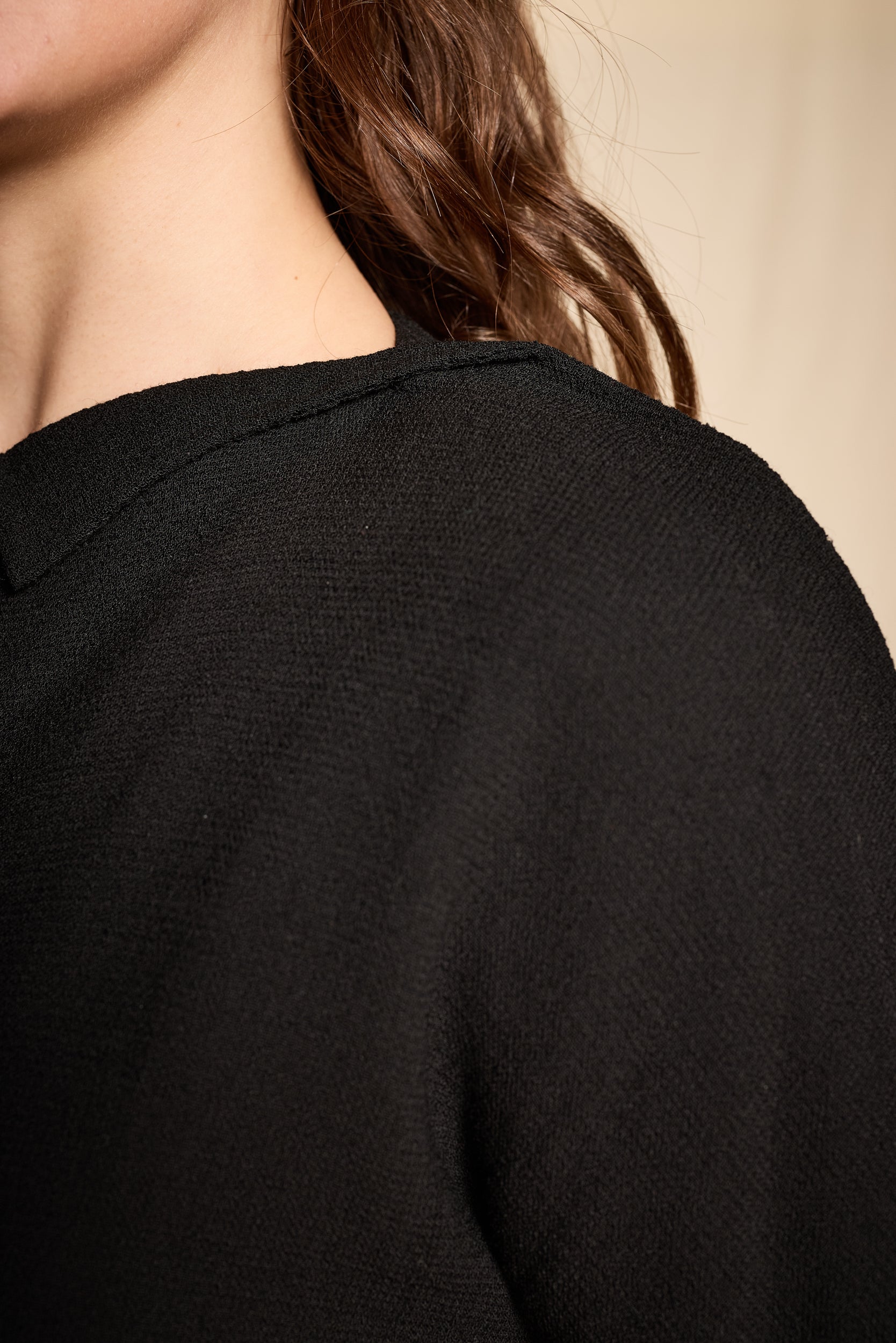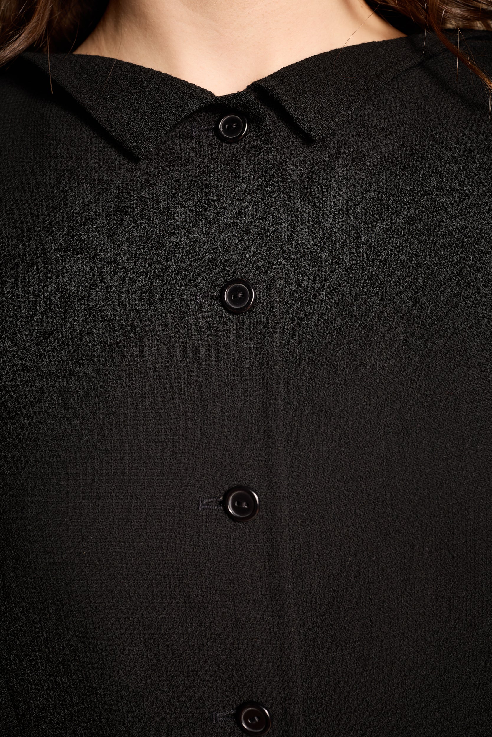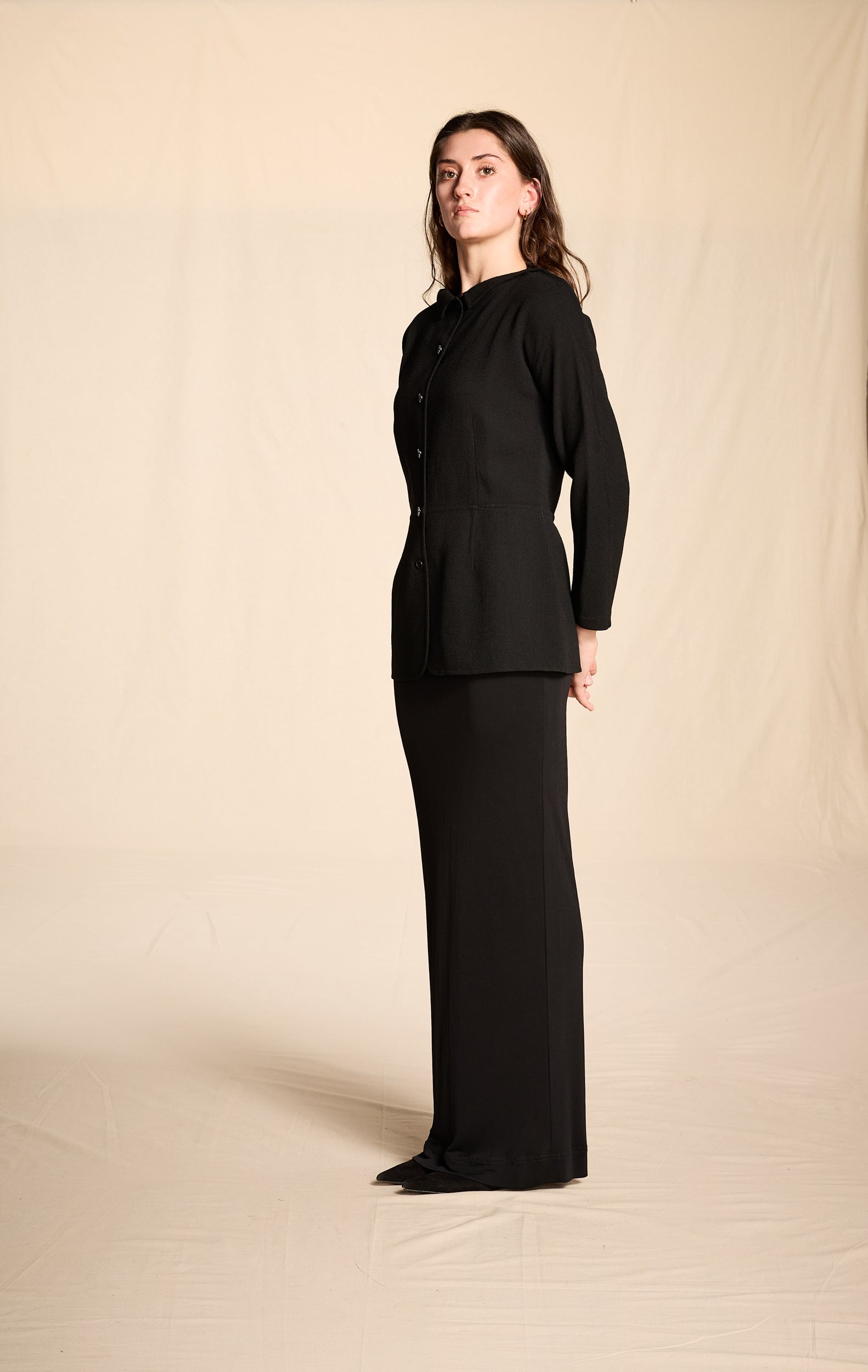 Manifold Vintage's Spring/Summer 2026 Collection features two black, crepey, 1990s Geoffrey Beene jackets; we think they are best described together. The jacket described in listing is Jacket B, this is Jacket A; a comparison image can be found in this listing’s photos.