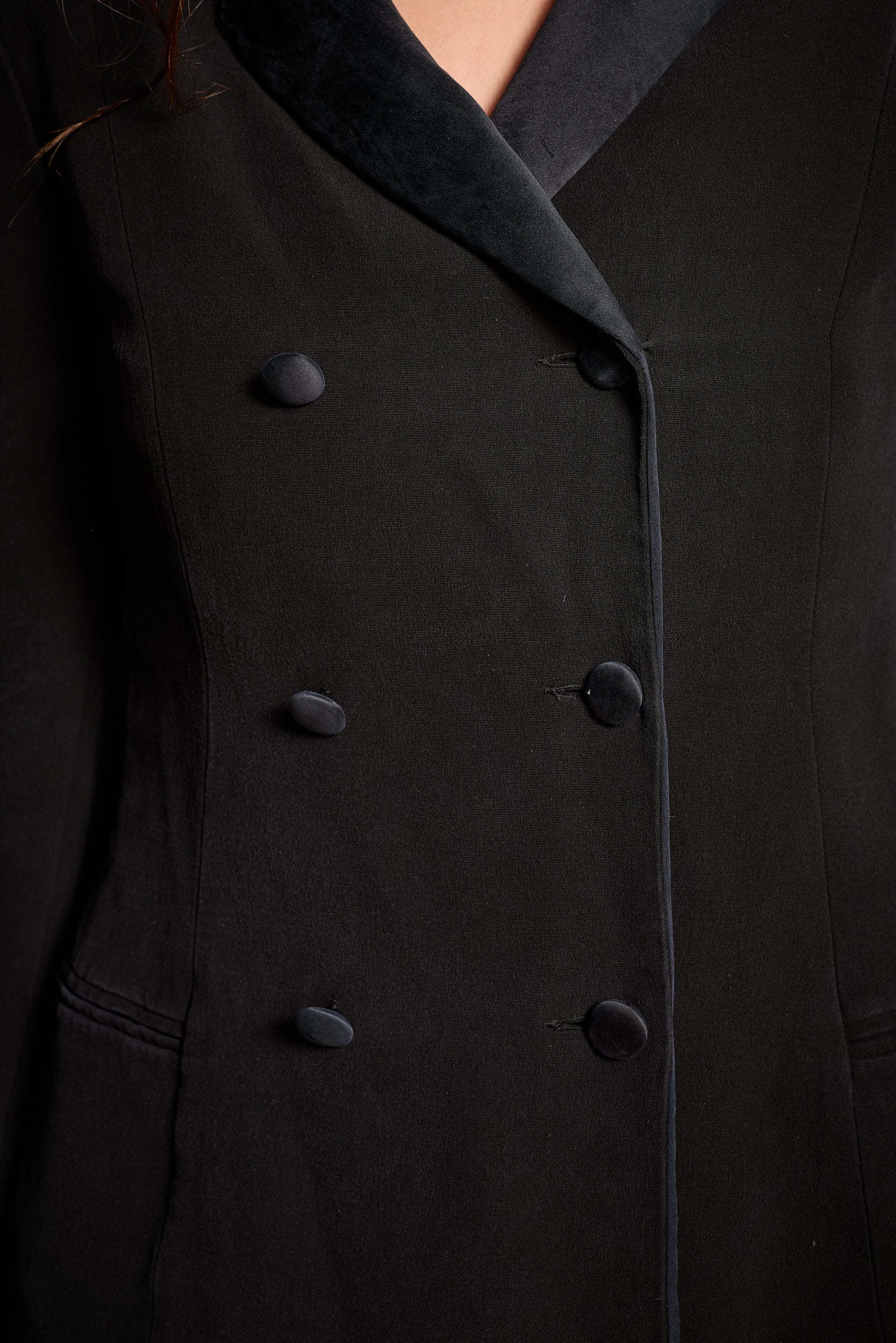 A classic example of 1990s Armani's menswear-inspired womenswear. In the 1990s, the Armani house and several peer institutions produced pieces that can be seen to straddle the boundary between menswear and womenswear. This jacket, for instance, contains elements strongly associated with menswear and with womenswear. It incorporates features of a men's tuxedo blazer: a double-breasted closure, silk-covered shank buttons, structured shoulders, and a silk lapel. Nonetheless, its construction elements attest to its status as womenswear: its slightly exaggerated waist, its princess seams, and the soft drape of its fabric. It falls almost like a blouse. A prior owner cut out its fabric composition elements, but we believe its outer is made from a rayon crepe, its decorative elements from a satiny silk charmeuse, and its lining from a silk crepe de chine.