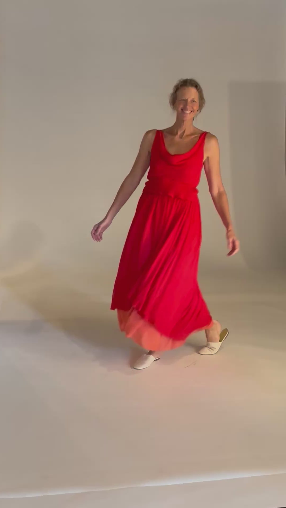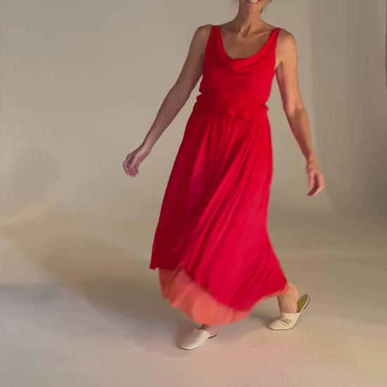 Halston tomato red and coral silk chiffon ensemble with cowl neck bias cut top and a gathered waist skirt with a high-low hemline.