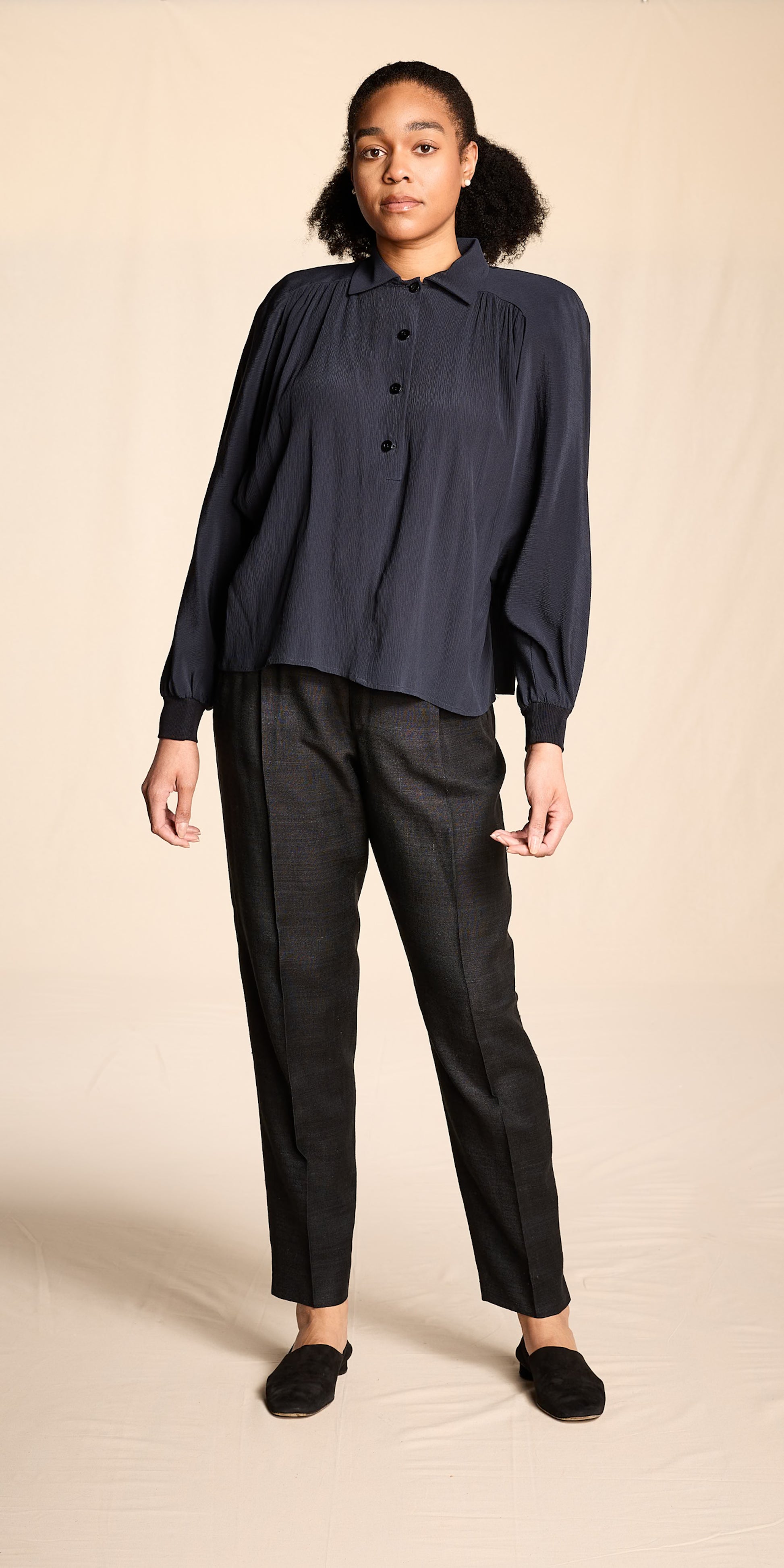 Valentino navy blouse with a dolman sleeve and a partial button front. Shoulder pads can be removed.