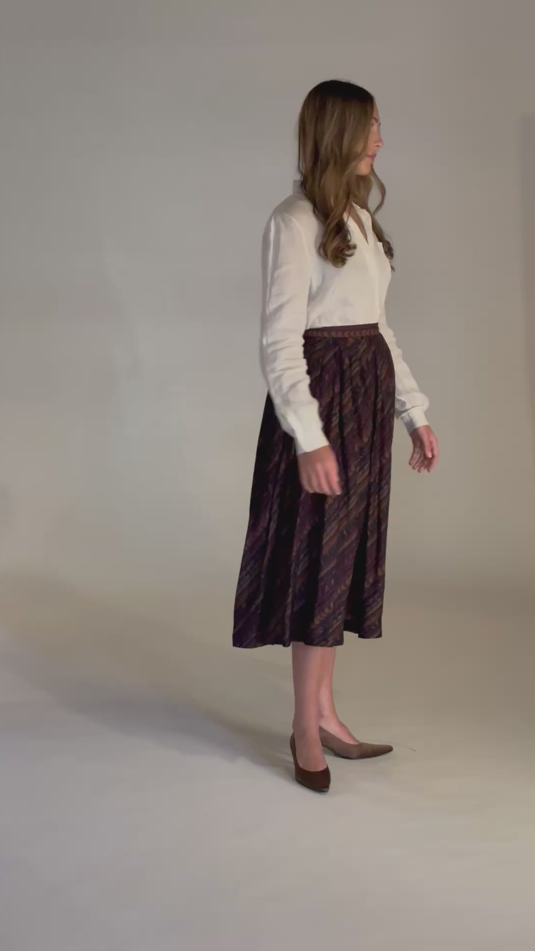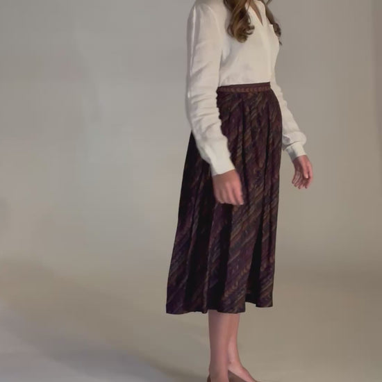 Pleated ankle length skirt by Emanuel Ungaro (Parallele), likely from the early 1980s, when the romantic western revival was in full swing. Teal, indigo, violet, chocolate, tomato, and crimson. Feels like a silk-wool blend.