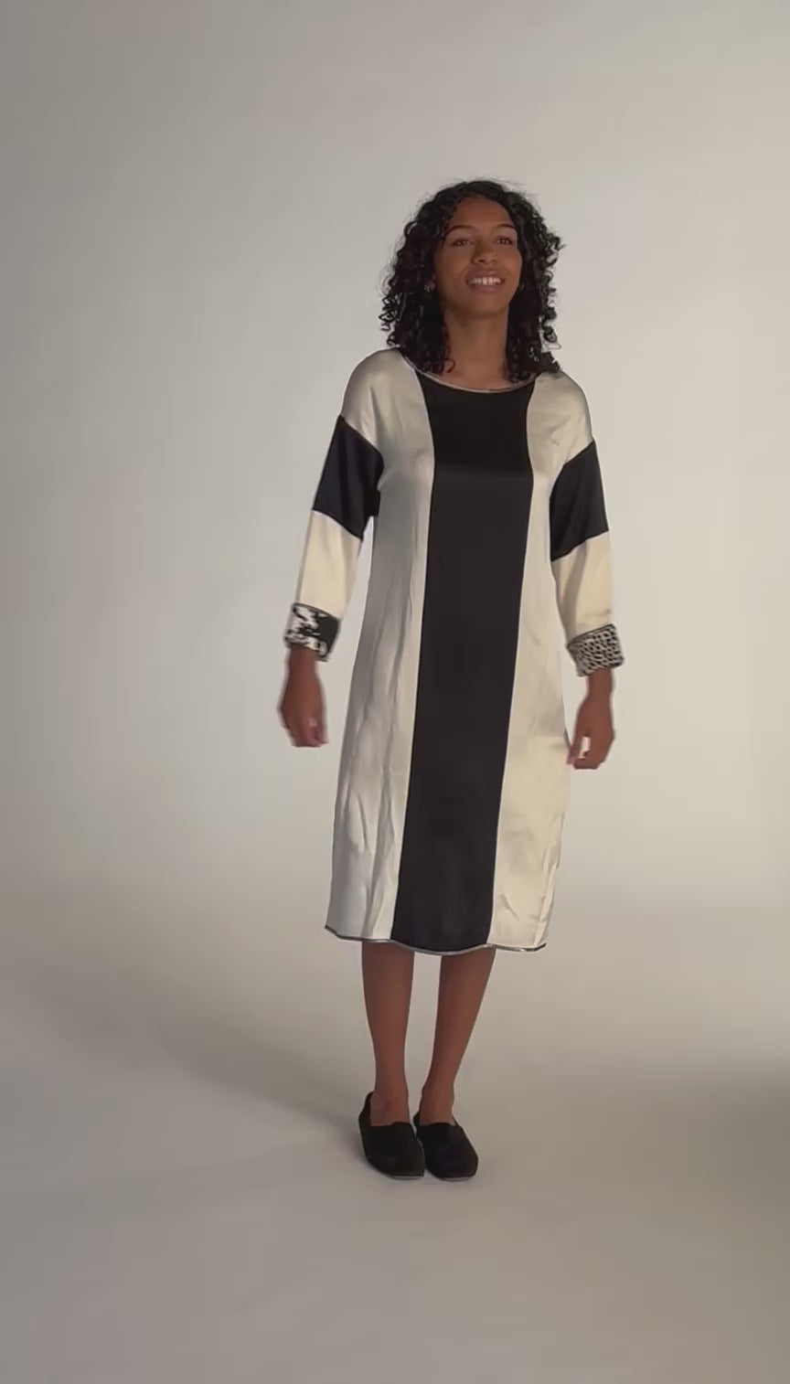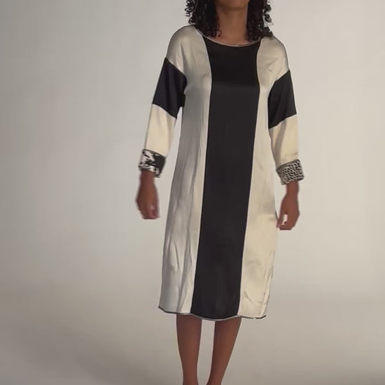 Geoffrey Beene black and cream mid-length silk paneled caftan out of mid-weight silk. The arm extends beyond the armscye, creating a winged, kimono-like sleeve. With red and silver accents and quilted cuffs.