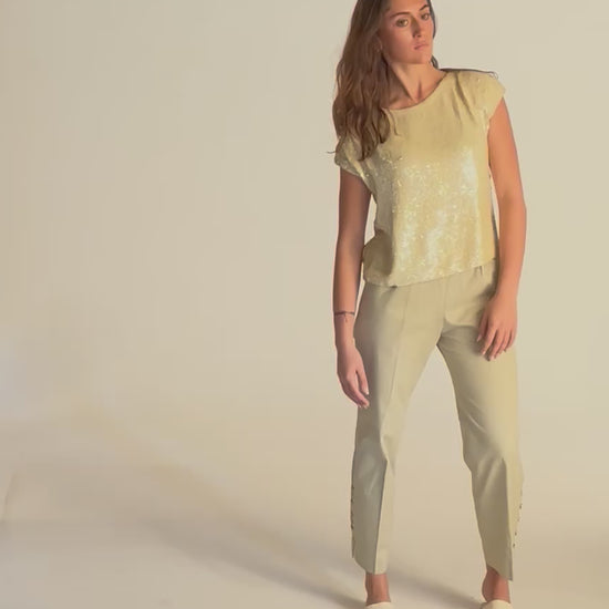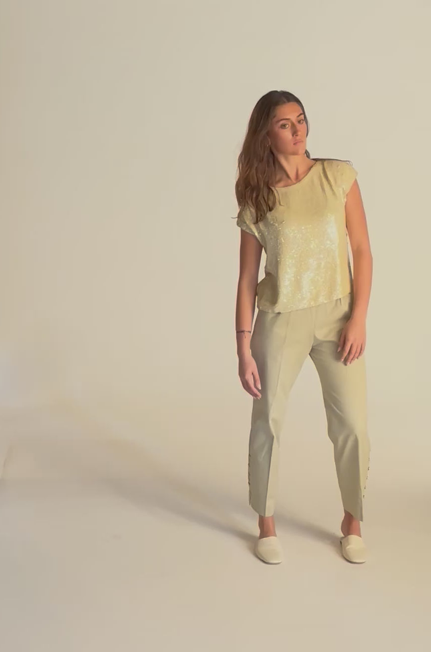 YSL khaki trouser pants with a tapered leg, side zipper and gold button closure, and gold button closures at the ankle. In excellent condition.